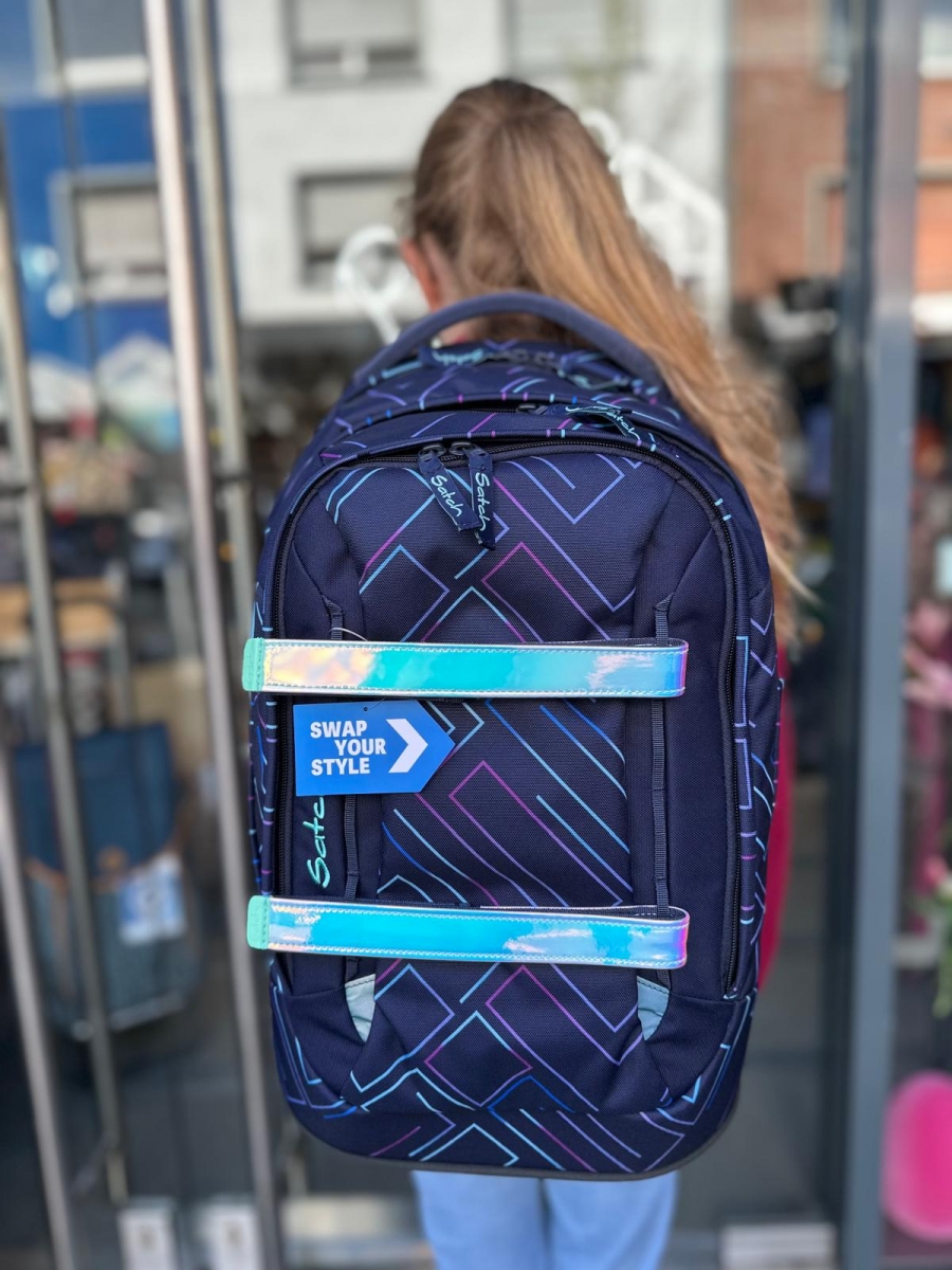Die Laser Akzente betonen die Linienführung des Schulrucksacks und umspielen beispielsweise die Vortasche, in der ein Schlüsselring mit langem Band, Stiftschlaufen und zwei Reißverschlusstaschen aus Mesh für Ordnung sorgen.